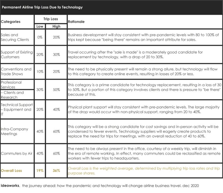 As result of these changes airlines are projected to see a reduction in business trips between 19% and a 36% , say one out of three business trips by air will be lost as direct consequence of new technologies adoption.